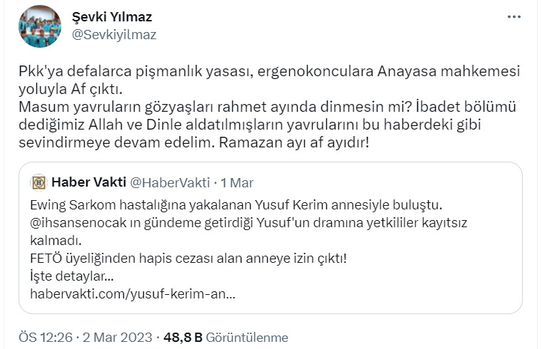 Tutuklu annesini yanında istiyen 6 yaşındaki kanser hastası Yusuf Kerim’den hareketli hakkaniyetli ve vicdanlı bir çağrıda bulunan Şevki Yılmaz’ın bu sözleri umulur ki yetkililer tarafından dikkate alınır!
