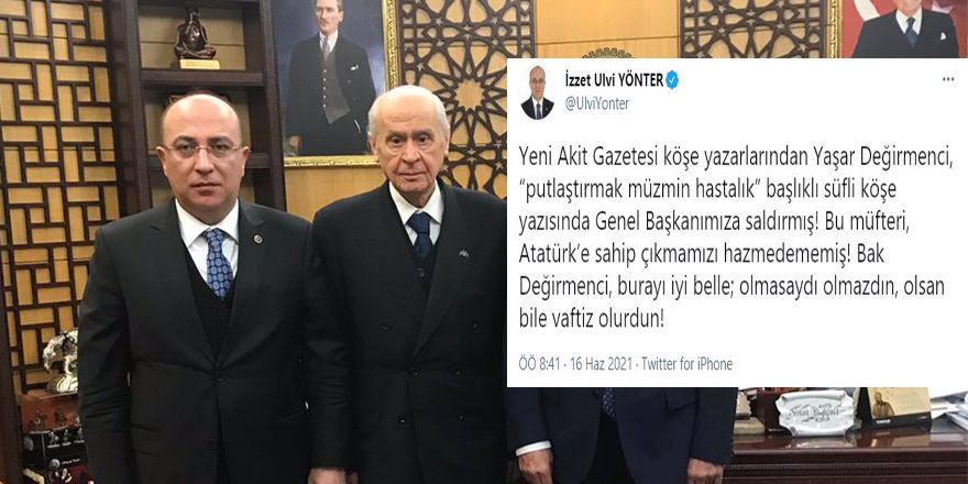 MHP Genel Başkan Yardımcısı İzzet Ulvi Yönter, sosyal medya hesabı Twitter’dan yaptığı paylaşımda şu ifadeleri kullandı: “Yeni Akit Gazetesi köşe yazarlarından Yaşar Değirmenci, ‘putlaştırmak müzmin hastalık’ başlıklı süfli köşe yazısında Genel Başkanımıza saldırmış! Bu müfteri, Atatürk’e sahip çıkmamızı hazmedememiş! Bak Değirmenci, burayı iyi belle; olmasaydı olmazdın, olsan bile vaftiz olurdun!”