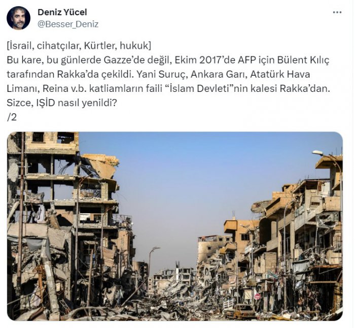 Deniz Yücel yerle bir edilmiş Gazze görüntüsünü normal bir şeymiş gibi göstermek için yerle bir edilmiş başka bir şehrin görüntüsünü kullanıyor. Kullanışlı aparat olduğu düşünülen IŞİD’in kontrolündeki Rakka’nın görüntüsünü…
