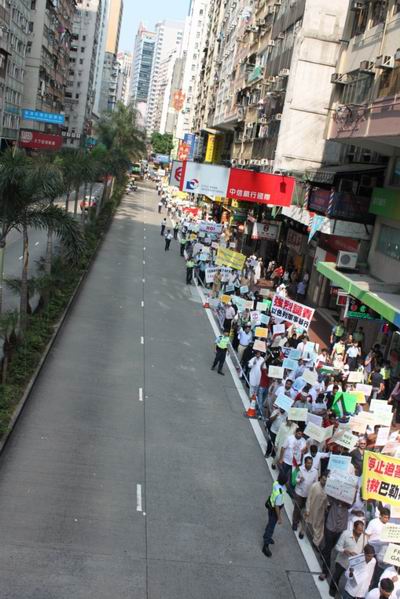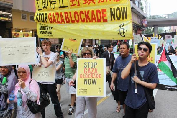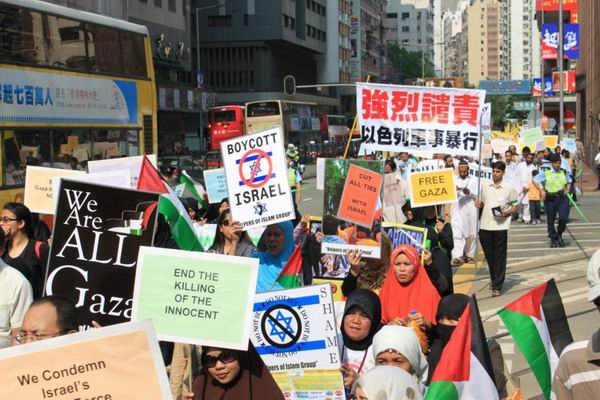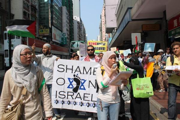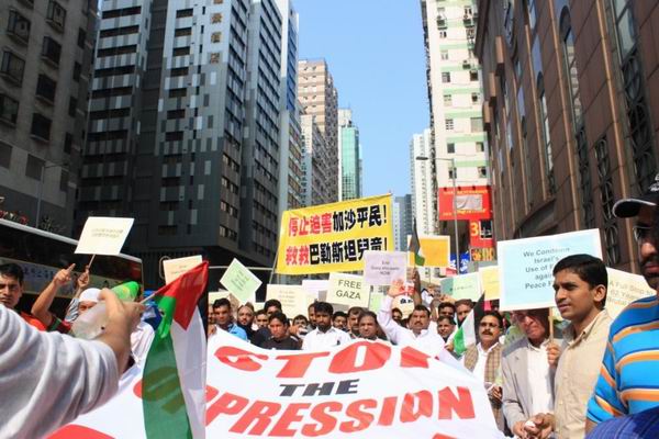 Yaklaşık on bin kişinin katıldığı protesto yürüyüşüne aralarında Çinli Müslümanlar Kültür ve Kardeşlik Derneği ve Hong Kong-Çin İslam Federasyonu gibi büyük derneklerinde bulunduğu yirmiye yakın sivil toplum örgütü ve çok sayıda vatandaş iştirak etti. Hong Kong Adası'ndaki Victoria Park'da toplanan kalabalık İsrail aleyhine sloganlar atarak yürüyüşe başladı. Yürüyüşe başlamadan önce dağıtılan İngilizce olarak 'İnsanlık destekte, Hong Kong'un barışsever vatandaşları' başlıklı broşürler dikkat çekti. İsrail aleyhine atılan sloganlar eşliğinde devam eden protesto yürüyüşü, Hennessy Caddesi takip edilerek Hong Kong'un merkezi bölgeleri olan Causeway Bay-Whan Chai istikametine doğru devam etti.