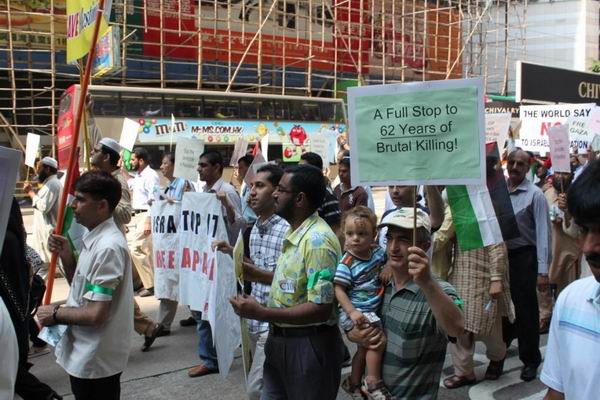 Son olarak Admiralty-Cenral bölgesi arasında bulunan İsrail konsolosluğu önüne gelen gurup İsrail aleyhine sloganlara devam etti. Basma Luk ve Sareena Hu adlı sivil toplum gönüllülerinin İsrail'in Batı Şeria ve Gazze'de bulunan Müslüman ve Hıristiyanlara uyguladığı katliamla ilgili bir bildiri okudu. Bildiride bu bölgede yaşayan insanların yaşadığı insanlık dramından söz edildi. Gurup saat beş sularında olaysız bir şekilde dağıldı.