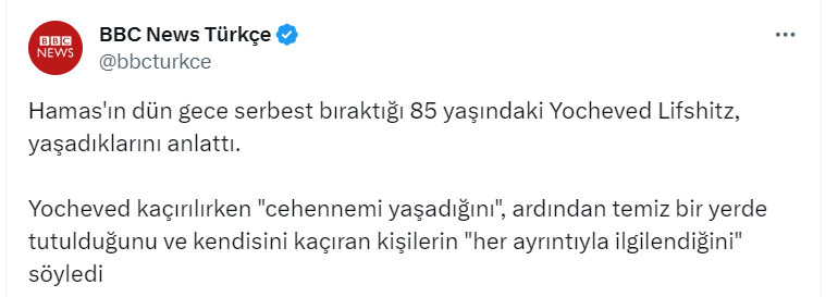 BBC Türkçe, Yochaved Lifshitz’in serbest bırakılması sonrasında yaptığı açıklamaları çarpıtarak verdi.