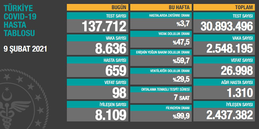 Ağır hasta sayısı 1310 oldu, 8 bin 109 kişinin Kovid-19 tedavisinin/karantinasının sona ermesiyle iyileşen sayısı 2 milyon 437 bin 382'ye yükseldi.