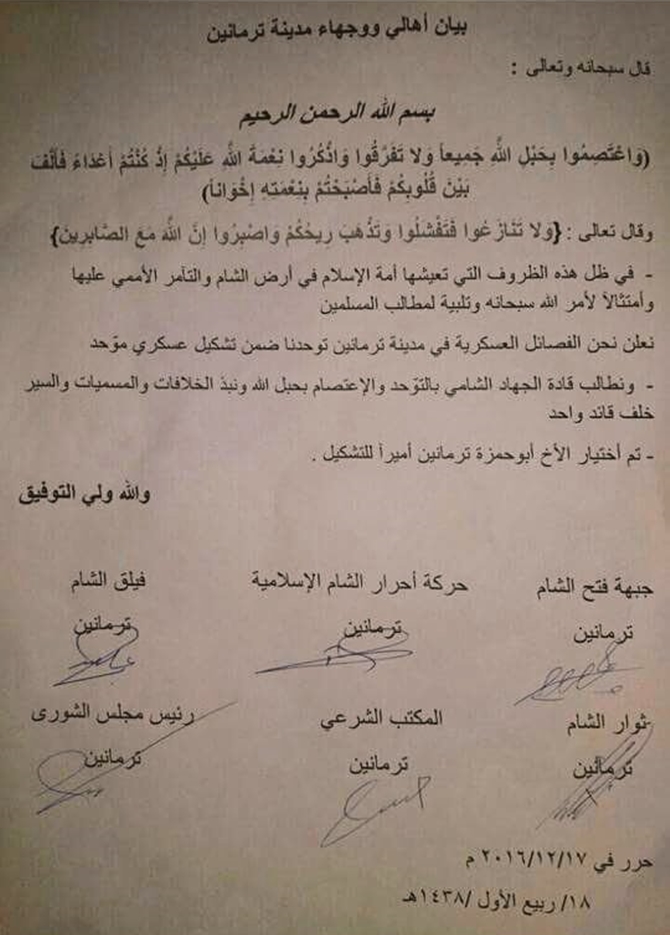 Ahraru’ş-Şam, Fethu’ş-Şam, Feylaku’ş-Şam, Suvaru’ş-Şam, el-Mekteb eş-Şer’î ve ilmî bir heyetin daha imzası bildiride mevcut.