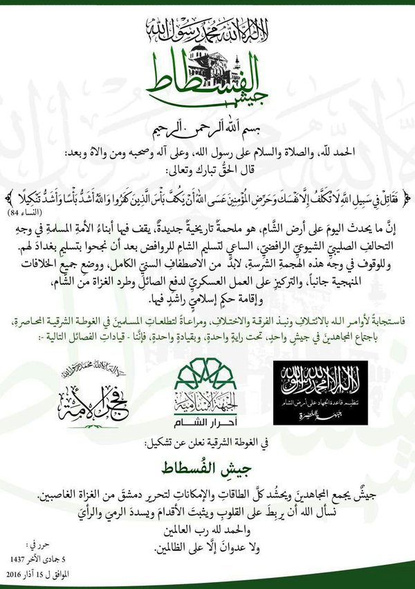 Fecr Alam, Nusret Cephesi ve Ahrar Şam grupları Ortak bir bildiriye imza atarak Doğu Guta bölgesine askeri harekat başlatmaya karar verdi.