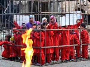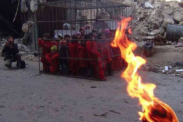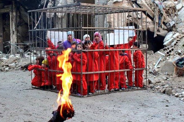 Sosyal medyada oldukça yayılan görüntülerde, çocuklar kafes içerisinde yakılmayı bekliyor görüntüsü verildi.