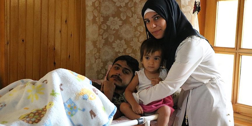 Halep’te Esed güçleriyle mücadelede keskin nişancı tarafından vurularak yaralanan ve bir bacağını kaybeden Suriyeli Kemal Elmasri, 2 yaşındaki çocuğu ve eşiyle Türkiye’de hayata tutunmaya çalışıyor.