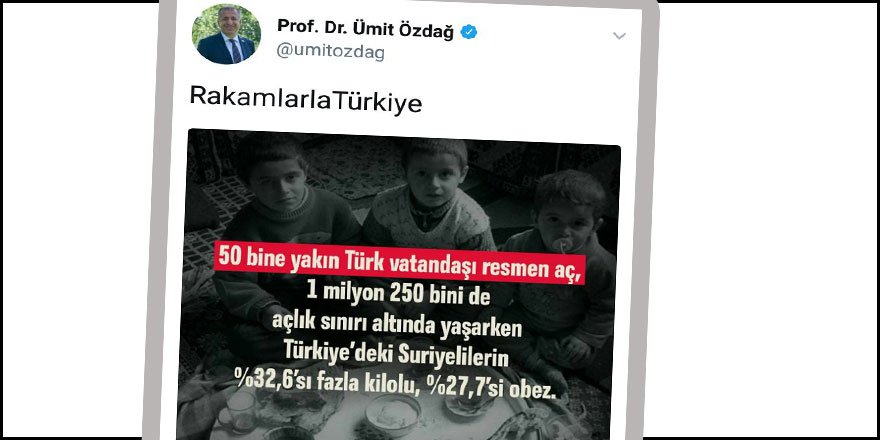 Eski MHP’li şimdinin İYİ PARTİ’sinin Genel Başkan Yardımcısı Ümit Özdağ, kaynağı meçhul bir istatistik ile Türkiye’de 50 bin aç Türkiye vatandaşı olmasına karşın Suriyeli mültecilerin bir kısmının tok, bir kısmının ise obez olduğunu rakamlarla paylaştı.