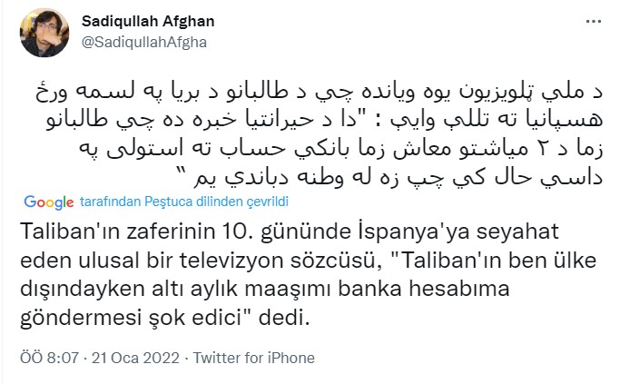 Gazeteci Sadikullah’ın aktardığına göre adam gecikmiş maaşının hesabına yatırılmasının ardından şok olmuş. Ulusal yayında çalışan ve ülkesini Taliban yönetmeye başladı diye terk eden adam, "Taliban'ın ben ülke dışındayken altı aylık maaşımı banka hesabıma göndermesi şok edici" dedi.