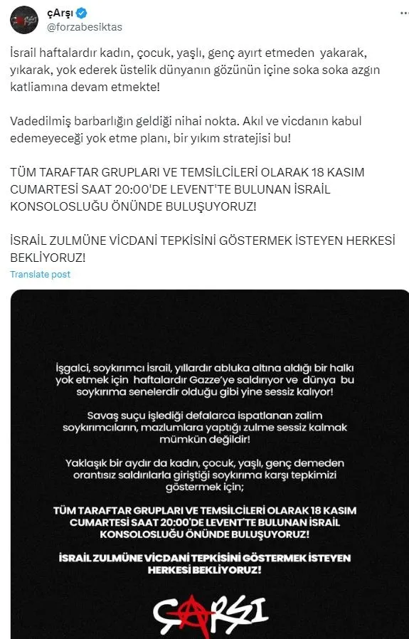 Türkiye'nin 4 büyük kulübünün taraftar grupları işgal rejimini protesto etmek için 18 Kasım Cumartesi günü saat 20.00'da Siyonist konsolosluk önünde bir araya gelecek.