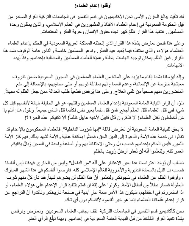 We strongly object to such a decison given by Saudi Arabia against these Islamic scholars just after the Ramadan feast, and we sincerely invite all Muslims and all people to give the necessary reactions against this loathsome decision. It is a great cruelty to accuse the scholars of Islam of wrongdoing and attempt to take them to gallows.