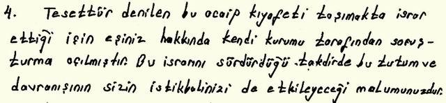 4) Tesettür denilen bu acayip kıyafeti taşımakta ısrar ettiği için eşiniz hakkında kendi kurumu tarafından soruşturma açılmıştır. Bu ısrarını sürdürdüğü takdirde bu tutum ve davranışınızın sizin istikbalinizi de etkileyeceği malumunuzdur. Çünkü; TSK, Atatürk'ün kurduğu bu Cumhuriyeti korumak, kollamak ve yine onun çizdiği yoldan ilerleyerek çağdaş uygarlık düzeyine yükseltmek görev ve misyonunu üstlenmiştir. TSK bu görevini yerine getirirken hem örnek ve önder olmak, hem de milletin dinamosu olmak durumundadır. Bu nedenle öncelikle kendi içinde tutarlı, sağlam ve yekvücut olma zarureti vardır. Bir siyasi partinin simgesi haline gelmiş ve onun yandaşlarının sözde üniforması haline dönüşmüş bir kıyafetin TSK personelinin eş ve çocukları tarafından giyilmesi ve TSK tesislerinde bu kıyafetle görülmesinin, üstlendiğiniz misyona ve laik, demokratik, çağdaş imajımıza ciddi zararlar vereceği, Cumhuriyet ve Atatürk devrimleri karşıtlarını da cesaretlendireceği değerlendirilmektedir.