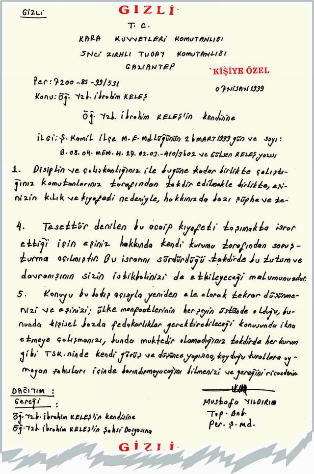 5. Zırhlı Tugay Komutanlığı Personel Şube Müdürü Topçu Binbaşı Mustafa Yıldırım, Öğretmen Yüzbaşı İbrahim Keleş'e gönderdiği 7 Nisan 1999 tarihli "Gizli" ibareli yazıda, başörtüsüne hakaret ediliyor, eşinin başını açmadığı takdirde ihraç edileceğini açıklıyor.