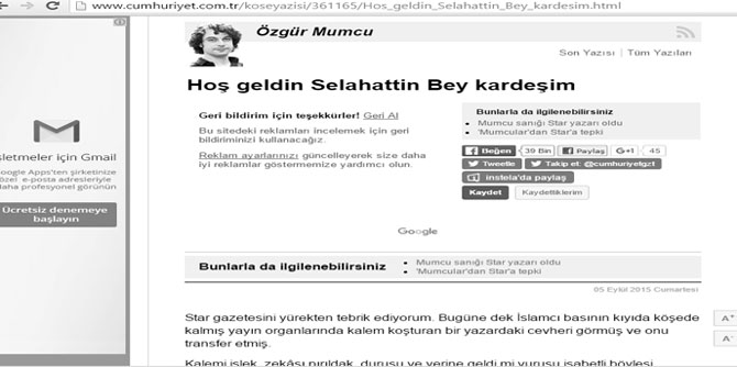 Özgür Mumcu'nun Sol tarafından bugün yazılmış gibi gösterilen ancak 5 Eylül 2015 tarihli söz konusu yazısı: