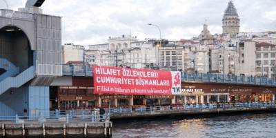 Türkçü-faşist bilumum ırkçı çevrelerin Filistin halkıyla yükselen dayanışmadan rahatsızlık duyup saldırıya geçmesine paralel biçimde TKP de Galata Köprüsüne pankart asıp ‘Hilafet özlemcileri’ni uyarmış!