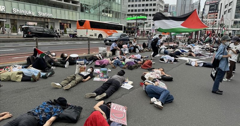 Japonya'nın başkenti Tokyo'nun işlek noktalarından Şincuku'da Filistin'e destek amacıyla toplanan onlarca kişi, İsrail'in Gazze'ye yönelik saldırılarına tepki gösterdi.