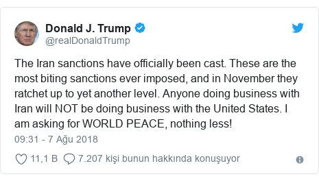 ABD'nin İran'a yönelik iki aşamalı yeni yaptırımlarını ilan etmesinin ardından, Trump Twitter hesabından bir açıklama yaptı. Trump, "İran ile iş yapan ABD ile yapmayacak" ifadelerini kullandı.