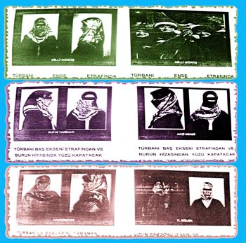 Jandarma İstihbarat ve TSK Psikolojik Daire Başkanlığınca hazırlanan fişleme dosyalarında resimli olarak hangi cemaate mensup kadınların nasıl giyindiklerini detaylı bir şekilde belirtiyor.