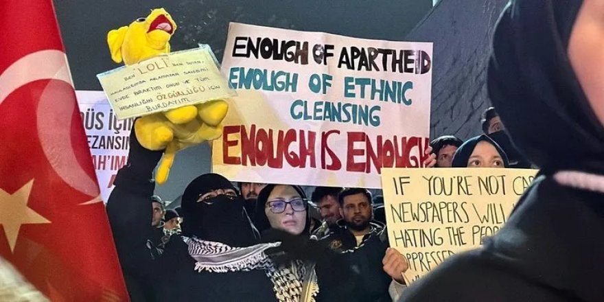 Açıklamanın ardından Filistin bayrakları taşıyan katılımcılar, İsrail ve ABD karşıtı slogan attı, tekbir getirdi.