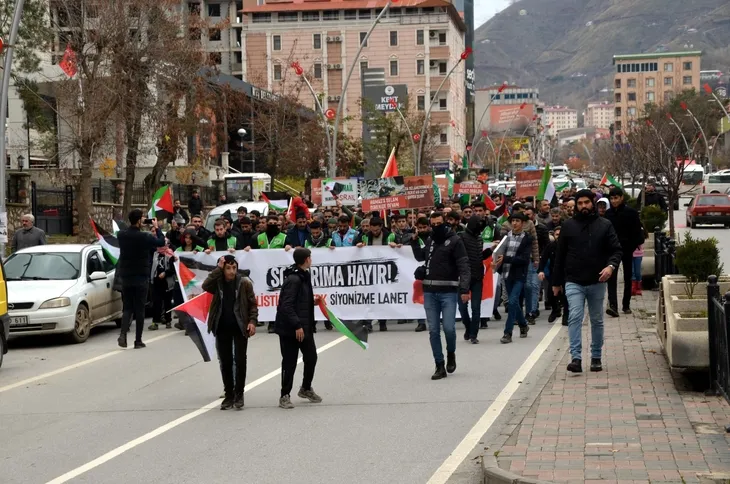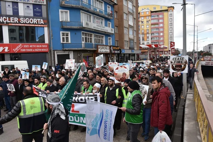 Kalabalık, ellerinde Türk ve Filistin bayrakları ile İsrail aleyhine yazılı dövizlerle İstiklal, Lise ve Gazi caddelerini takip ederek Cumhuriyet Meydanı'na kadar sloganlar atarak yürüdü.