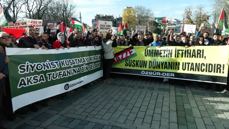 Meydanda bir araya gelen kalabalık "Katil İsrail, Filistin'den defol" ve "Gazze'ye selam, direnişe devam" sloganları attı, "Soykırıma hayır" pankartı açıldı.