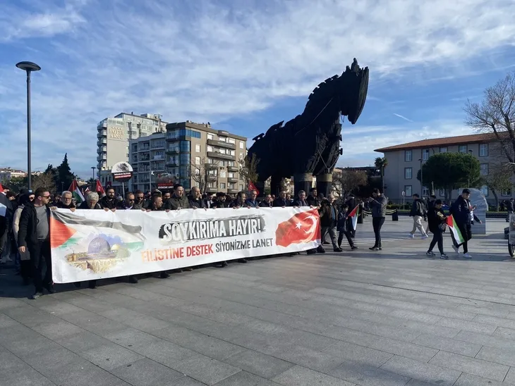 Çanakkale'de Filistin'e Destek Platformunca düzenlenen ve Kordonboyu'ndaki Necip Paşa Camisi'nden başlayan yürüyüş, İskele Meydanı'nda sona erdi.