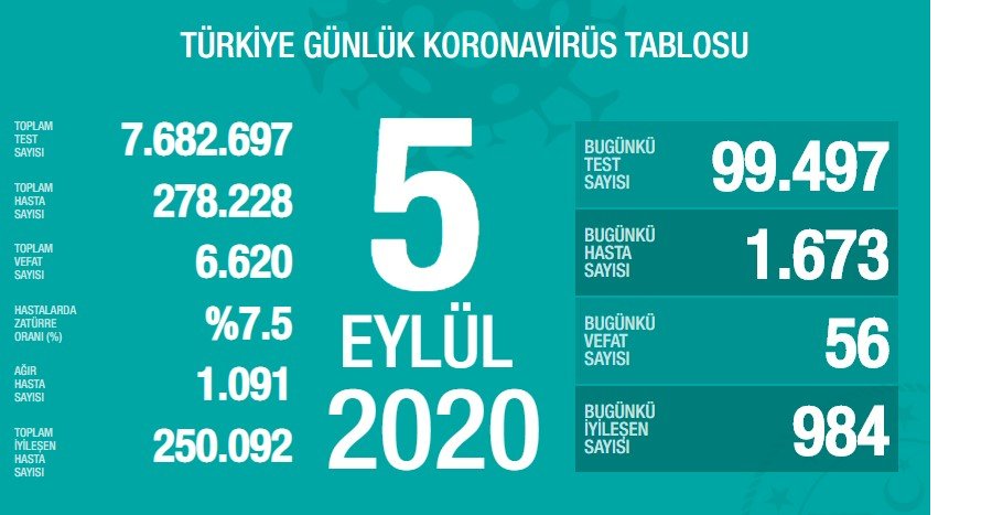 Toplam vaka sayısı ise 1673 artarak 278 bin 228'e çıktı. 948 kişinin de virüsü yendiğini belirten Bakan Koca, toplam iyileşen hasta sayısının 250 bin 92 olduğunu bildirdi.
