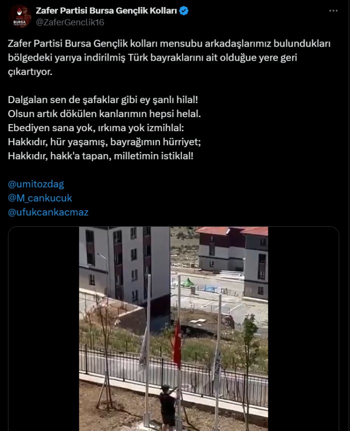 Zafer Partililer Bursa’da bayrakların İsmail Heniyye için yarıya indirilmesini kabul etmeyerek tekrardan eski haline getirdiler. Zafer Partisi Bursa İl Başkanlığı’nın hesabından paylaşılan görüntüler ırkçıların hiçbir sınırı olmadığını gözler önüne seriyor.