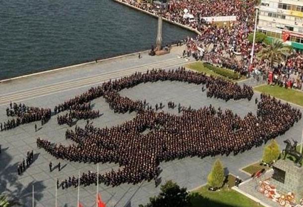 İzmir Cumhuriyet Meydanı'nda toplanan 2 bin 400 kişi 'Canlı Atatürk' portresi oluşturdu.
