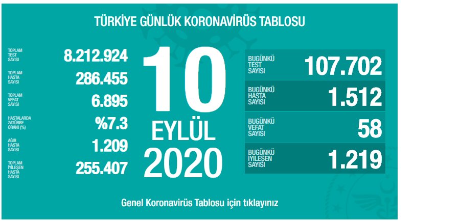 Sağlık Bakanlığı Türkiye'nin günlük koronavirüs (corona virüs) tablosunu açıkladı. 10 Eylül Perşembe gününün verilerine göre 58 kişi hayatını kaybederken bin 512 vaka tespit edildi. Bakan Koca, sosyal medyadan yaptığı açıklamada, ‘Aktif hastaların yaş ortalaması 42. Yoğun bakım hastalarının yaş ortalaması ise 65’ dedi.