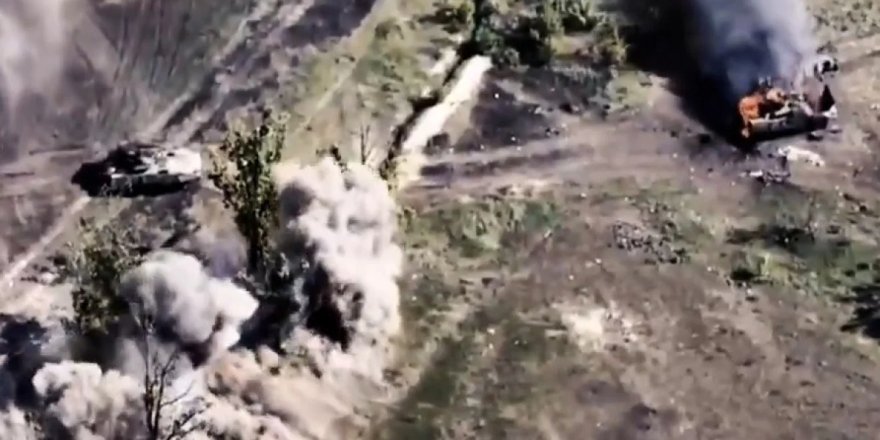 Havadan çekilen görüntülerde, Rusya'ya ait onlarca zırhlı araç vurularak imha edildi.