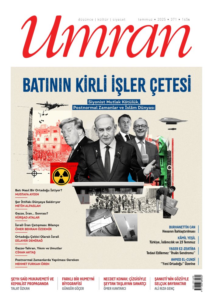 Postnormal dünya düzeninde eskiden doğru kabul edilen görüşlerin itibar kaybettiği, yenilerinin henüz doğmadığı ve çok az şeyin anlamlı olduğu görülüyor. Aksa Tufanı’ndan bu yana Filistin’de, Lübnan’da, Suriye’de ve İran’da yaşananlar dünyanın her yanında büyük yankılar uyandırdı. Mutlak kötülüğü temsil eden Siyonistler, Gazzelilerin uğradığı zulümleri ve ağır baskıları unutturup nükleer programını bahane ederek İran’a saldırdılar. Mütecavizlik uluslararası hukukun açıkça ihlali olduğu hâlde Türkiye, Pakistan gibi birkaç ülke dışında güçlü bir şekilde kınanmadı. Oysa on binlerce insanın katledildiği Gazze’de yürütülen soykırımcı savaşı eleştirenler antisemitist olmakla suçlanmaya devam ediyor. Buna rağmen gerek Batı toplumlarında gerek küresel güneyde sömürgeciliğe, işgale, insanlık haysiyetini hiçe sayanlara verilen tepkiler çığ gibi artıyor. Bu bağlamda Umran dergisinde Ortadoğu’daki gelişmelerin yanında Türkiye ve dünya gündemi ele alınıyor. Ayrıca hevanın ilahlaştırılması, İznik Konsili, Şeyh Said Mukavemeti, 15 Temmuz, İslâmcılık, Selçuk Bayraktar’ın hayatı, Necdet Konak’ın karikatürleri üzerinde duruluyor.