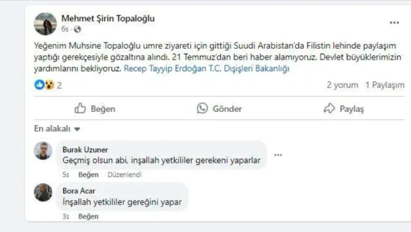 "Yeğenim Muhsine Topaloğlu umre ziyareti için gittiği Suudi Arabistan’da Filistin lehinde paylaşım yaptığı gerekçesiyle gözaltına alındı. 21 Temmuz’dan beri haber alamıyoruz. Devlet büyüklerimizin yardımlarını bekliyoruz."