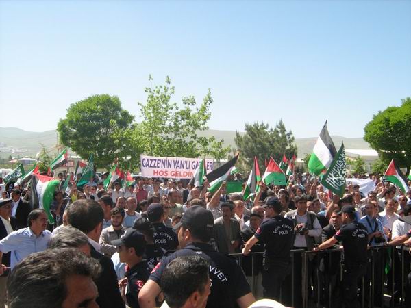 Gazze'ye insani yardım malzemesi götüren Mavi Marmara gemisine İsrail karasularına 71 mil uzaklıkta bulunan denizde, dünyanın gözü önünde askeri baskın düzenleyen siyonist rejim askeri korsanları, cani çehresini bir kez daha dünya kamuoyunda ifşa etmiş oldu. İHH'nın "Rotamız Filistin, Yükümüz İnsani Yardım" isimli Gazze'ye yardım gemisinde yer alan ve aralarından kolundan aldığı kurşunla yaralanmış bulunan Abdulhelim Almalı'nın de bulunduğu grup Van'a ulaştı. Dini kaygıları olan bütün dernek ve örgütler, isimleriyle değil insan olma özellikleriyle bu vahşeti kınamak maksadıyla, gönüllüleri karşılamak üzere bu konvoya katılmıştı. Hava yoluyla Van'a ulaşan gönüllüler, büyük bir halk kitlesi tarafından karşılandı. Filistin bayraklarıyla karşılamaya gelen kalabalık, gönüllüleri sevgi seli ve çiçeklerle bağrına bastı. Gönüllülerden Arif Koçer, Abdulhalim Almalı, Muhlis Baran, Kemal Çelen, Mehmet Çakan ve Mehmet Eyüp Acar konvoy eşliğinde Kültür evine kadar gittiler. Oradan Sanat sokağına kadar bir yürüyüş düzenlendikten sonra, Telekom önünde gelen gönüllüler kısa bir konuşma yaptı. Yaşadığı dehşet dolu saatlere rağmen kutsal bir görevi ifa etmenin huzuru içinde olduğunu söyleyen Koçer, İsrail'in cinayetkar yüzünü yakından gördüklerini söyledi. Sivil insanlara gerçek mermi ve bombalarla saldırıldığını anlatan Gazze yardım gönüllüsü Koçer, "Biz 7 tane sivil gemi iken, bize 40 tane bot, 2 tane denizaltı, helikopter ve savaş gemileri ile müdahale edildi. Yakınımızdaki arkadaşlarımız gerçek mermilerle şehit edildi veya yaralandı" dedi.