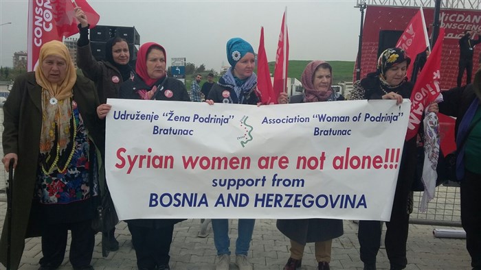 Türkiye'deki STK'lı bayanların öncülüğünde dünyanın farklı şehirlerinden hareket edip Hatay'da buluşan kadınlar, Suriyeli kadınların feryadını duyurmak için hep birlikte ve tek yürek olarak seslerini yükselttiler.