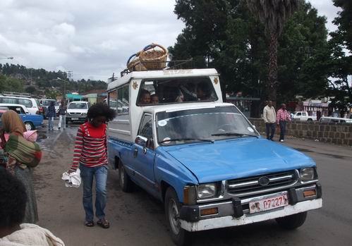 Dolmuş tarzı çalışan mavi-beyaz minibüslerde müşterileri hızla indirip bindiren cevval muavinler Türkiye'ye dair hatıraları canlandırıyor hemen. Ancak buralarda işleyen araçlarda ama özellikle dolmuş minibüslerde dine dair semboller hemen göze çarpıyor. Hıristiyan unsurların araçlarındaki "haç" işaretlerine Müslümanlar araçlarındaki "maşallah" yazılarıyla mukabele ediyorlar. Müslüman-Hıristiyan farklılığı hayatın bütün alanlarında kendisini gösteriyor. Trafiğin yavaşladığı veya durma noktasına geldiği anlarda aracımızın iki yanında beliren dilencilere bakınca dahi bu farklılığı görmemiz mümkün. Sırtlarına bağladıkları küçük çocukları ile dilenen kadınların boyunlarındaki haça eşlik eden yüzlerinin çene ve boyun bölgesine dövme olarak işlettikleri mavi renkli haç sembolleri bunlardan biri sayılabilir. Diğer taraftan aracımızın üzerindeki "maşallah" yazısını fark eden küçük çocuklar tarafından okunan Amharice ilahileri duyabiliyoruz.
