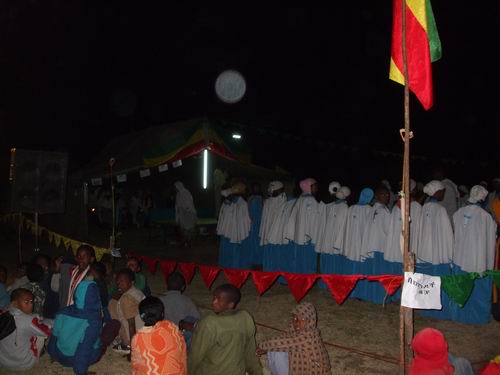 Gece yarısına doğru şehrin bir bölümünden geçerken önce konser olduğunu zannettiğimiz geniş bir alan içerisinde toplanan büyük bir kalabalık görüyoruz. Hemen aracımızı durdurup alana doğru yürüyoruz. Gördüğümüz manzara çayırın ortasına kurulmuş bir sahnede güçlü sesi ile kilise ilahileri söyleyen bir kadın sanatçı ve kendisine eşlik eden ayrı ayrı kız ve erkekler korosu. Kadın sanatçının sesi gerçekten çok güçlü ve sesi de oldukça güzel. Sanatçıya önce koro eşlik ediyor sonrasında ise meydanda toplanan binlerce insan. Şarkıyı dansla, müziği şiir ve duayla iç içe geçiren bir tarzın kimi zaman coşkulu kimi zaman hüzünlü ezgilerine binlerce insanı katmayı başaran bir etkinlikle karşı karşıyaydık. Kitle sanatçının uyarısıyla sık sık ayağa kalkıyor, el ele tutuşuyor ve birlikte dua edip âmin diyor. Arkadaşımız Fennan bu tür etkinliklerin haftada üç-dört akşam yapıldığını, kilisenin bilgi ve perspektif kazandırmakla uğraşmayıp daha çok popüler ilahiciler, ezgiciler aracılığıyla kitlesini muhafaza etmeye uğraş verdiğini anlatıyor bizlere. Vokal ayin müzikleri ile ayakta durmaya çalışan bir öğretiye dönüşmüş bu din anlayışı her şeye rağmen Batılı kilise ve teşkilatlardan yardım alarak Etiyopya'nın rengini, siyasetini ve kültürünü etkileme iddiasında.