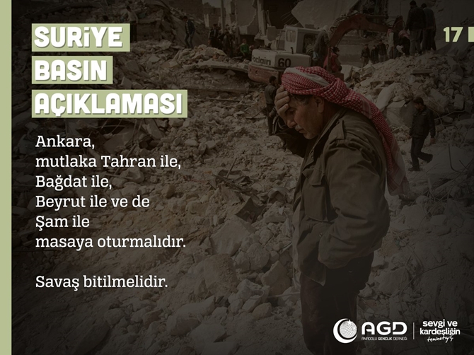 Anadolu Gençlik Derneği (AGD) son günlerde Halep’te yaşanan katliamlar hakkında yaptığı açıklamada Ankara’ya Tahran, Bağdat, Beyrut ve Şam ile masaya oturmasını tavsiye ediyor. Bu açıklamalardan anlaşılan bağlı oldukları partinin eski genel başkanı Mustafa Kamalak’ın Şam’da Suriye halkının katili Beşşar Esed’i ziyaret etmesine benzer bir tavrı hükümetten beklemekteler.